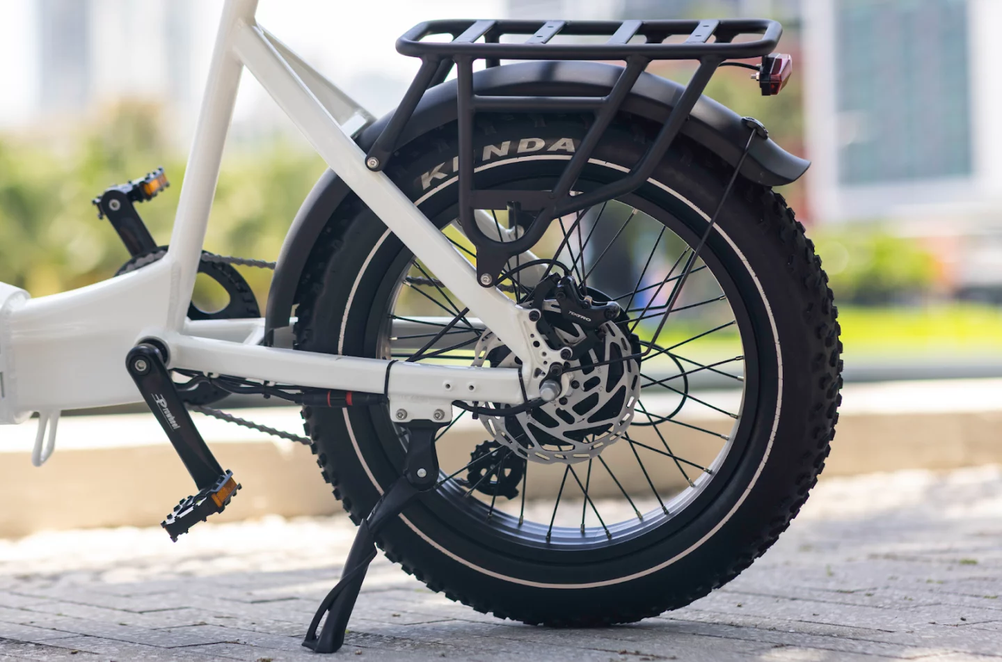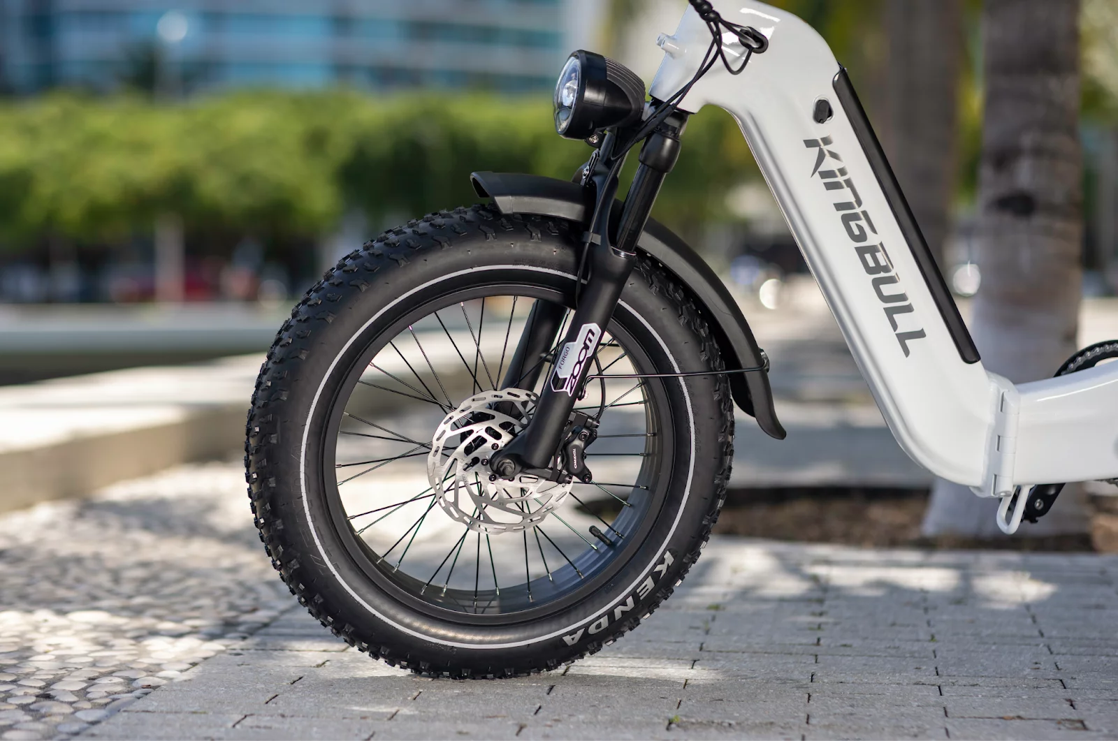 The 20x4.0” Kenda tires are basically traction marshmallows... wide, grippy, and remarkably stable. They absorb chatter, shrug off gravel, and float over rough city terrain with an audible lack of complaint.