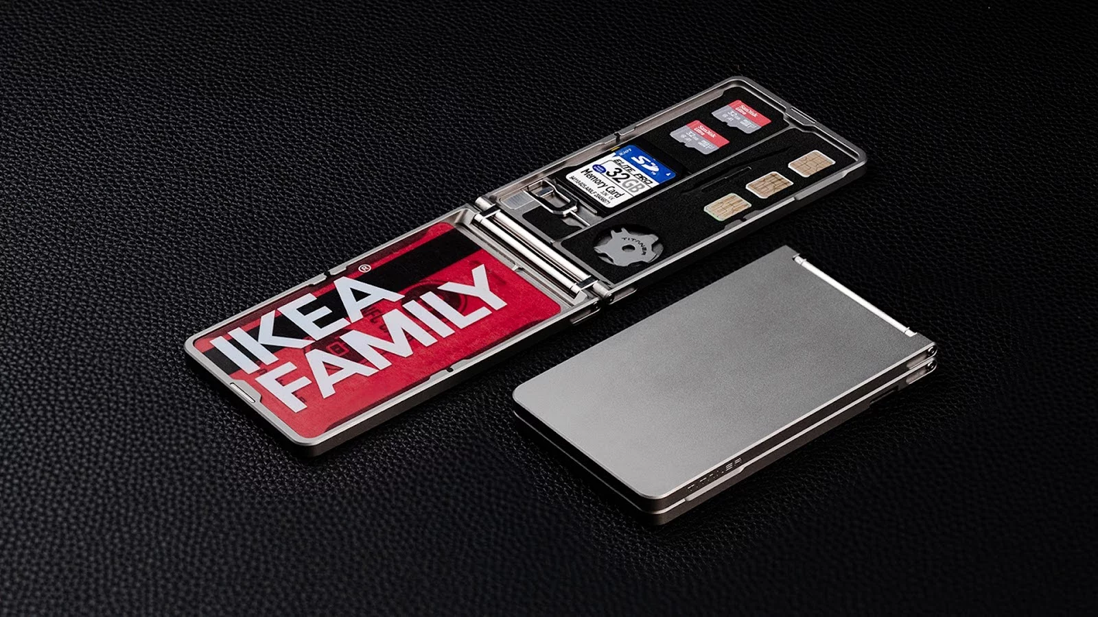3.The main surface gives you quick access to your most-used card, while hidden underneath are thoughtful tools: a SIM pin, hex tool, blade, SIM/SD card slots, and even a couple of folded bills — all neatly arranged in a customizable EVA module.