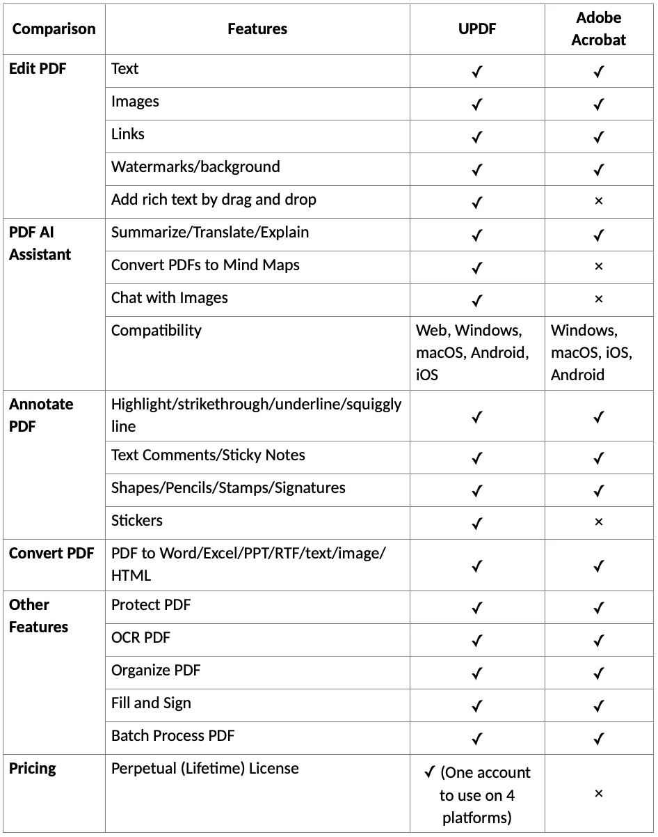 Many aspects of UPDF make users believe that it is the best option for PDF software. Below are a few key differences/advantages UPDF offers compared to other mainstream PDF editors: