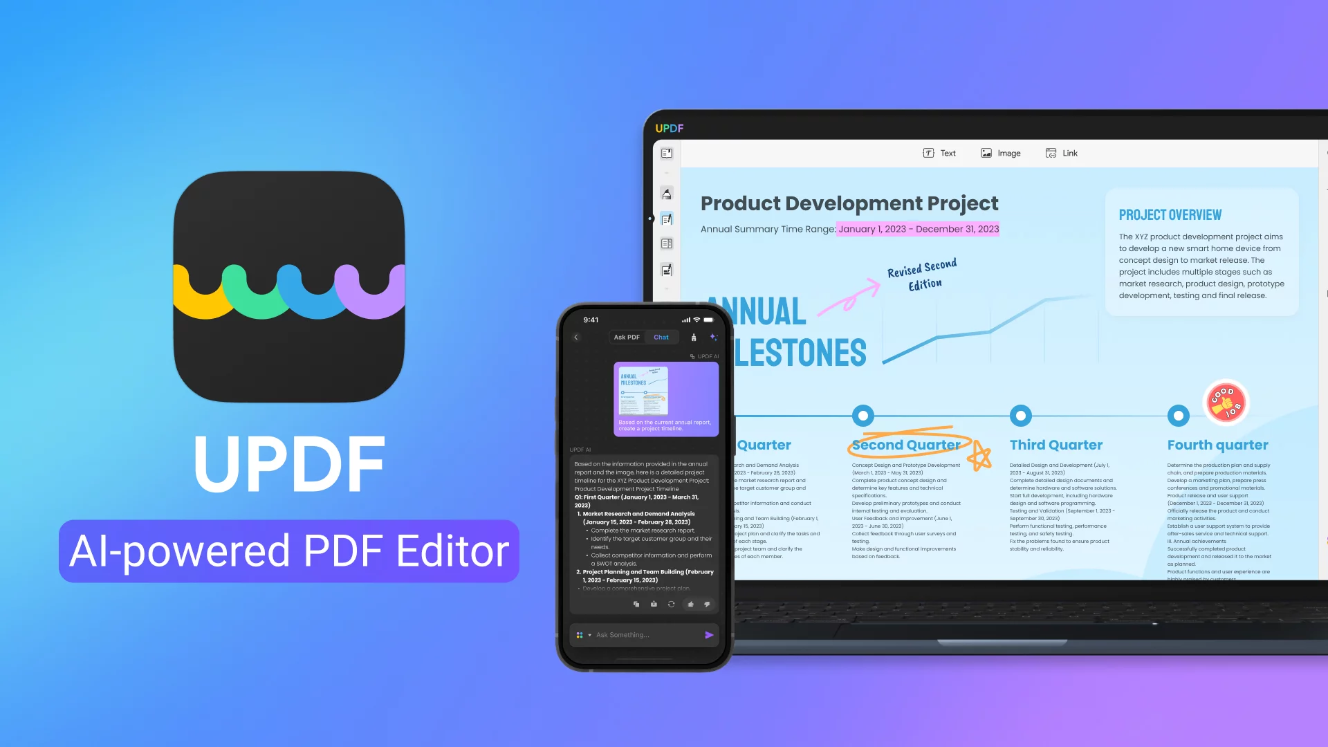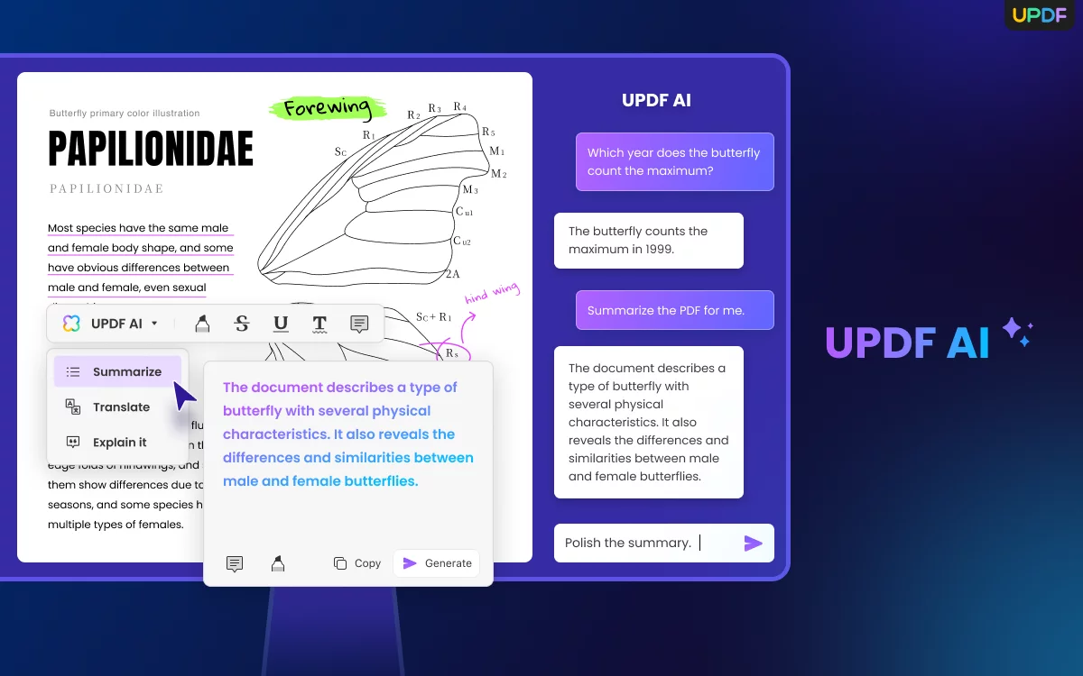 UPDF is a powerful and modernized PDF editor with AI-driven features. It provides a unified platform to read, edit, annotate, convert, protect, and organize PDFs. Its AI assistant helps to summarize/translate/explain PDFs, convert PDFs to mind maps, chat with images, and do a lot more.