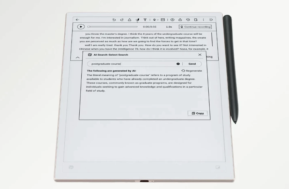 The iFLYTEK AINOTE 2 leverages AI to streamline daily workflows. A Smart Bar / AI button allows quick access to chat and search, letting users locate local notes and schedules through natural language. Meeting tools include one-tap minute generation and a circle-to-search gesture that extracts key points in real time. AI-assisted handwriting conversion, template-based articles, and automated daily or weekly reports help professionals save time and stay organized.