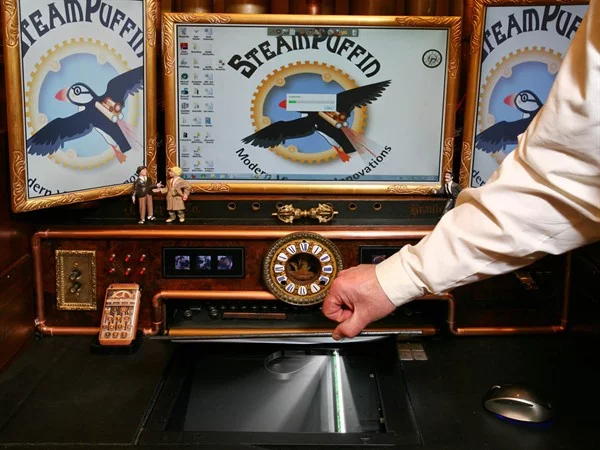 Rounding off the technical specifications for the computer and peripherals is a fairly standard wireless laser mouse, this input device will be the next to receive the artificial aging Steampunk treatment. Until then, a replica of Rod Taylor's Time Machine from the 1960 film of the same name stands in for photo opportunities and when visitors call. Finally, there's gigabit ethernet and the 64-bit version of Windows 7 Ultimate edition.