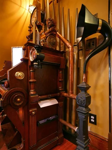 Behind the desk are, of course, the organ pipes. These were salvaged from a now demolished church and are the non-functioning fancy show pipes that often decorated chapel organs of the period while the actual working pipes were hidden from view. The more observant will probably note that the Rosenbaum's have "turned them upside down because they looked more like ‘steam pipes’ and the interesting narrow end with the hole was more visible above the desk."