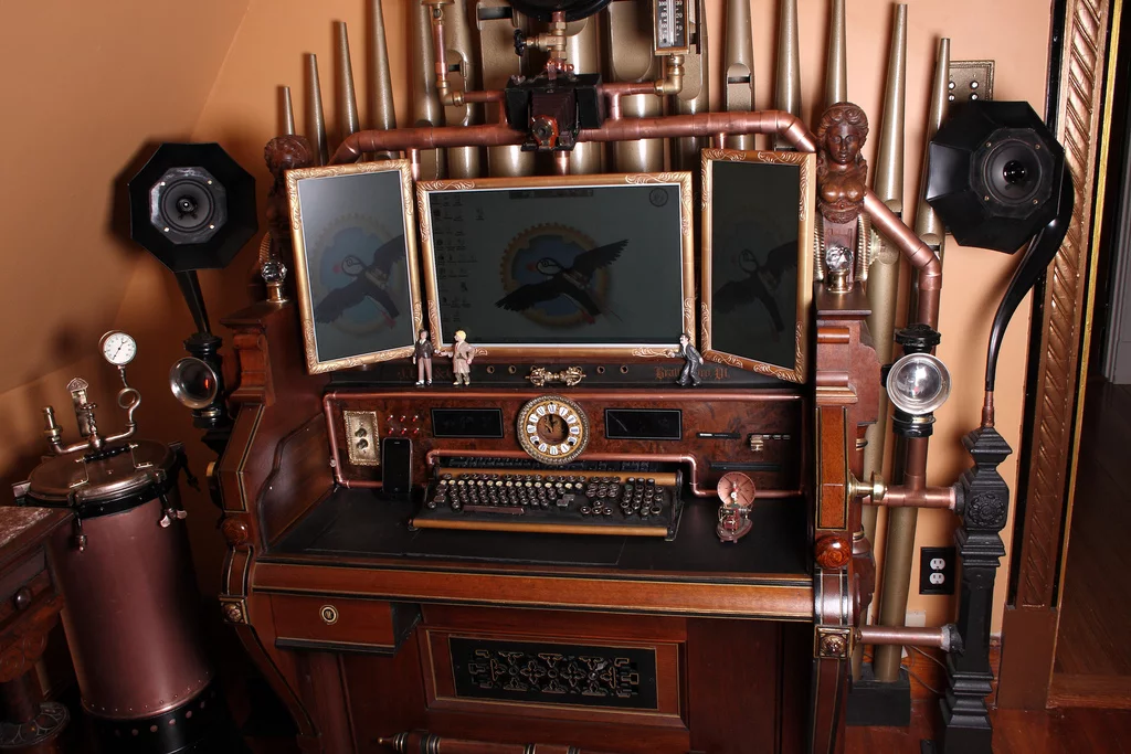 Bruce and Melanie Rosenbaum share a passion for Victorian high design but also enjoy all that modern technology has to offer. Happily both needs have been met by applying some Steampunk design principles to authentic or reproduction period furniture and appliances. The latest in an impressive line of projects to be completed by the couple has merged a reclaimed pipe organ with modern computer technology to produce the utterly gorgeous Victorian Organ Command Desk.