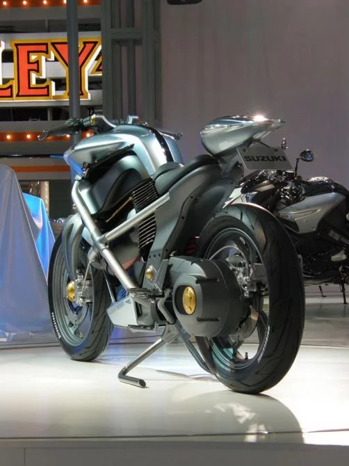 October 25, 2007 Here’s one of the more radical concept motorcycles we’ve seen in a while – Suzuki’s Crosscage concept is a fuel-cell powered electric bike with single-sided suspension front AND rear. The brushless electric motor’s mounted inline with the rear wheel, and looks-wise it’s so far out there that it’s on its way back again. Seems like Bridgestone’s even developed a special futuristic-looking tyre to match the bike’s oddly tesselated discs.