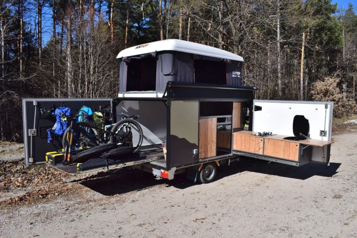 Blackcamp has developed a high-precision tool for exploring the mountains via four wheels, two wheels, two feet, etc. Its Freeda squaredrop trailer tows nimbly before popping, swinging and sliding into a cozy alpine hut for deep-wilderness expeditions.