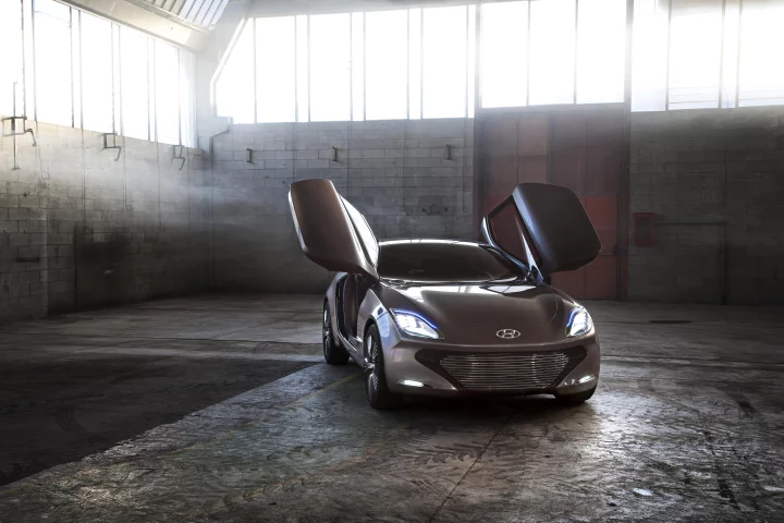 Hyundai's 80 kW four-seater i-oniq electric sports hatchback concept rolled out at Salon International de L'Automobile this week, using a range-extending petrol engine to boost the electric-only range of 120 km (75 miles) to beyond 700 km (435 km).
