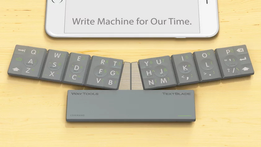 Weighing just 1.5 oz and measuring 104 x 30.6 x 11.3 mm, the TextBlade comes with a carry sleeve for the keyboard that also doubles as a stand for a smartphone or tablet when using the keyboard. It is compatible with iOS and Android devices with BLE.