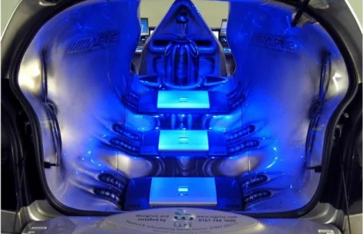 On the outside, the C2 by SQ Plus has also been radically modified - even the filler cap has been moved! A Cituning wide arch body kit, twin Powerflow exhausts which emerge from the front bumper, 20" chrome alloys and Mr Chilli's air bag suspension have all been added while the coup de grâce is the stunning silver re-spray with airbrushed paint finish worth GBP20,000 pounds.