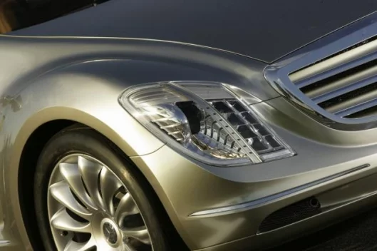 The distinctive front fenders likewise are inspired by a current production model, the S-Class. But here again the theme has been taken further and the fenders have been very distinctly sculpted. The side skirts are gently integrated into the flowing forms. The door handles are recessed and the exterior mirrors are little works of art – nothing should unnecessarily resist the flow of air. The 21-inch wheels are designed like turbine blades. Luminescent strips on the wheel arches emphasize the contours and size of the tires. The transparent cover over the rear wheels enhances aerodynamic efficiency.