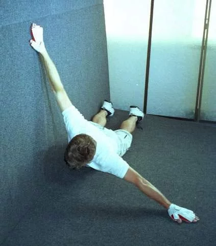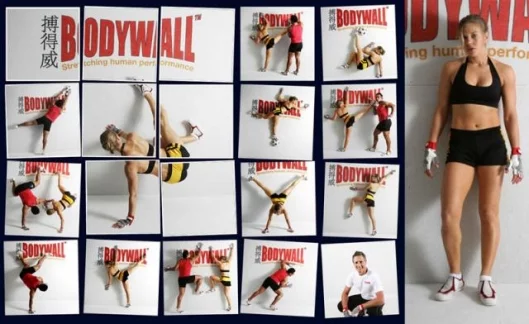 To use Bodywall, you pull on high-adhesion, rapid-release 3M developed Dual Lock gloves and shoes. The special wall material and the gloves together offer enough grip for gecko-style adhesion – enough grip to hold the weight of a 200 pound powerfully-built Maori Full Back steady while he stretches. Bodywall holds you while you a very effective targeted exercise for athletes of all disciplines but has evolved into an indoor/outdoor, low-footprint exercise gym that can be set up inside the smallest hotel room or could be done at billboard size as a promotional activity.