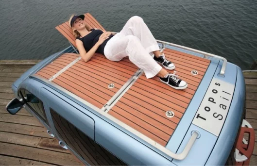 August 28, 2008 One of the stars of this weekend’s Dusseldorf Caravan Salon is this Volkswagen Caddy Topos Sail design concept which takes its nautical theme to the extreme of having a wooden boat deck on its roof. The Caddy Topos Sail design concept, based on the smallest model in the Volkswagen Commercial Vehicle van range, uses design cues from classic yachts and has its multi-functional roof covered with wooden decking surrounded by aluminium roof rails.