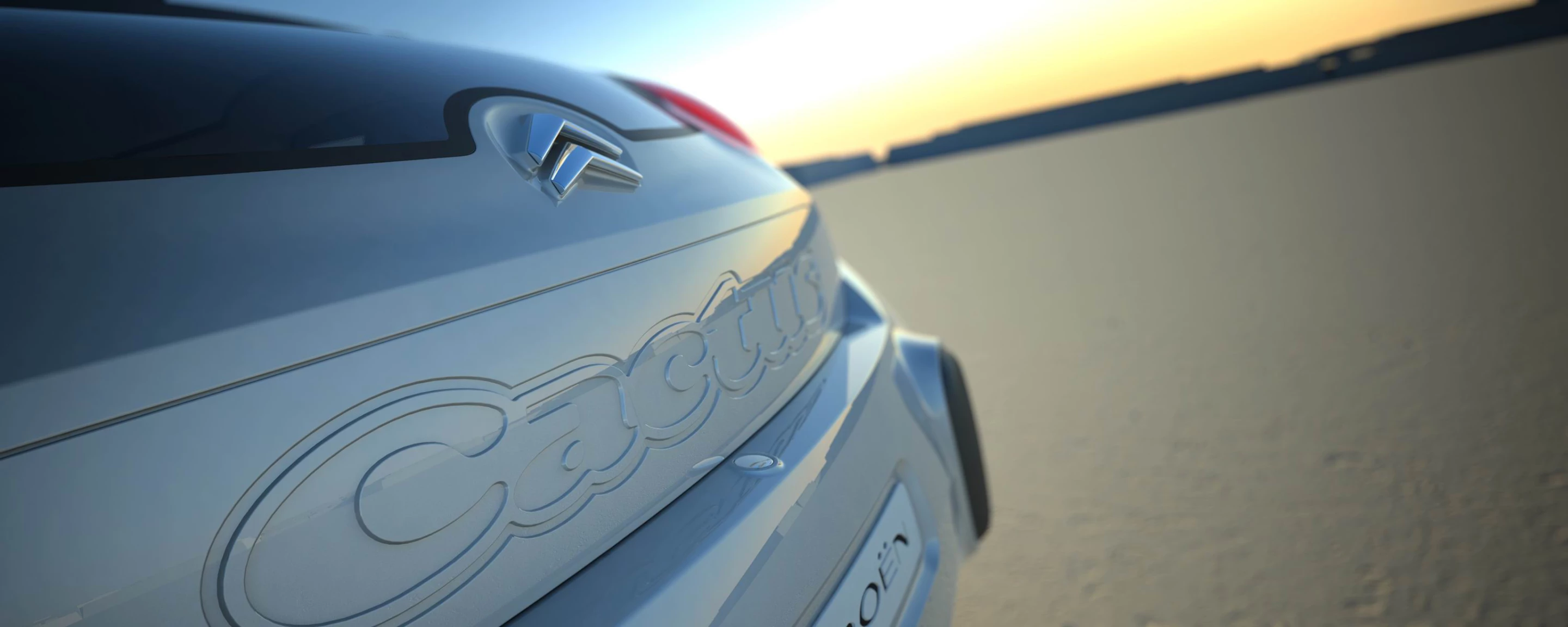 The same styling codes can be seen at the rear, where a combination of curves and taut lines illustrate the car's dynamic and appealing personality. The chevrons identify this car as a Citroën. The name "Cactus" appears in relief on the bottom of the tailgate, in a young, smooth, modern printface.