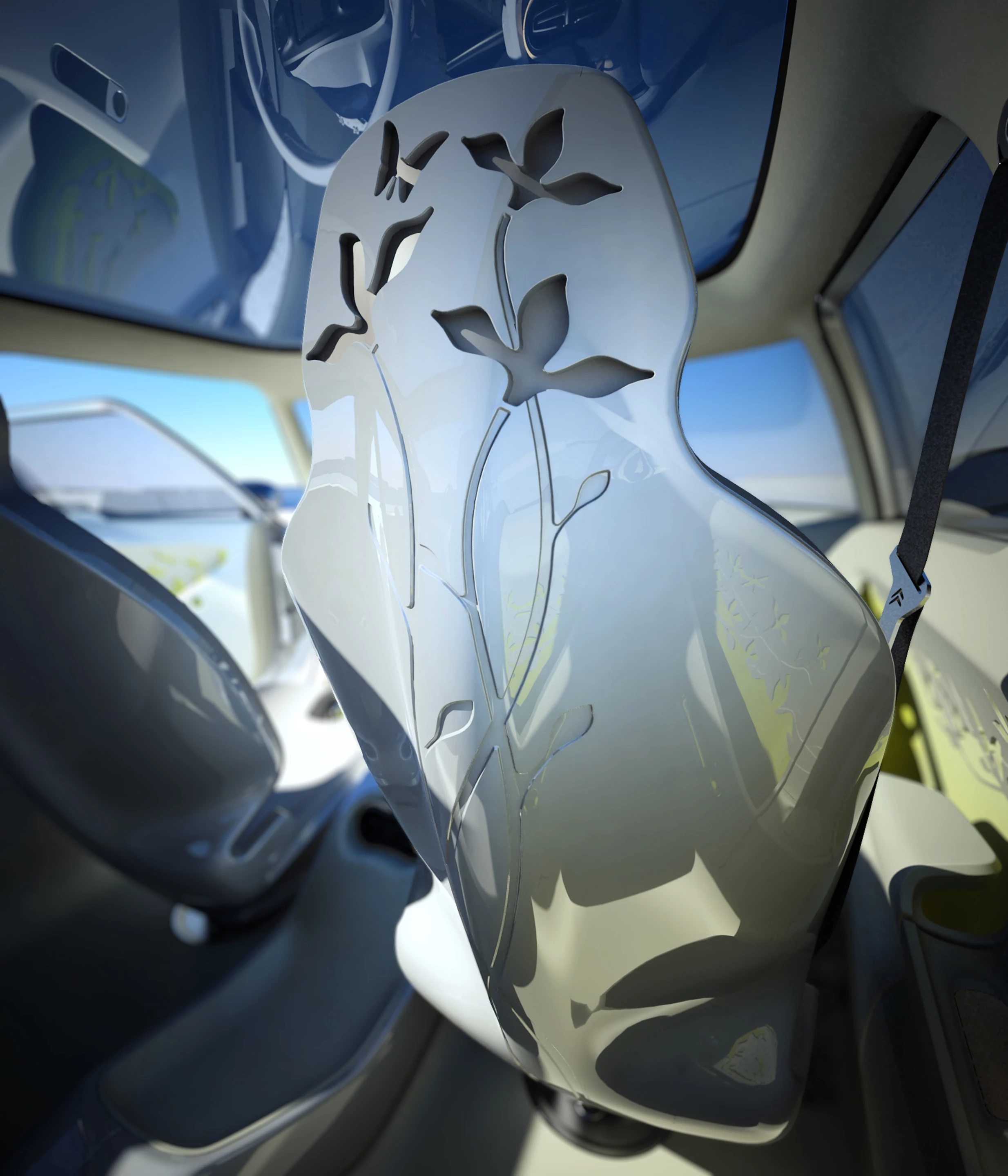 The same flower, plant and butterfly patterns – symbolising the environment, purity and well-being – are also found on several other cabin features. They are cut out, for example, in the white lacquer seat frame. These cut-outs show the coloured foam used for the seat cushions and give it a decorative quality.