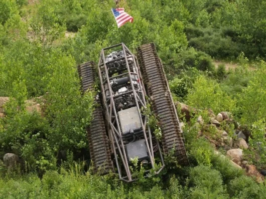 One of the most exciting potential platforms for the RGS is the Howe Brother's Ripsaw MS-1 currently under development . The Ripsaw's innovative long-travel suspension system and tracked drive system give it awesome capabilities for an Unmanned Ground Vehicle (UGV) – the 650 horsepower Duramax 6.6L V8 diesel engine delivers 900 ft/lbs of torque and can propel its 6500 pound girth to 50 mph from standstill in around four seconds. By spinning one track backwards, it can turn in its own length and take a 30 foot high 45 degree hill in its stride. It is very unlikely that you'll outrun the Ripsaw and unlike most tracked vehicles, it's very unlikely to throw a track – the "shark-fin" track system was inspired by the chainsaw. The ever-entertaining David Crane has the full story on the Ripsaw at Defense Review.