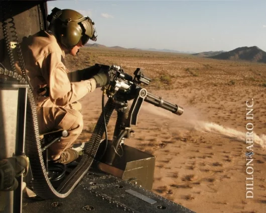 The Dillon Aero M134D is an electrically powered, six barrelled Gatling gun capable of fixed firing rates of either 3,000 or 4,000 7.62 MM NATO rounds per minute. It can be powered by AC or DC power sources and as it is designed as a modular system, it can be easy adapted to any existing platform. This flexibility allows it to perform equally well in the fixed-forward fire or crew served mode. It is simple to load and with an average of 30,000 rounds between stoppages, one of the most reliable weapons in the world.