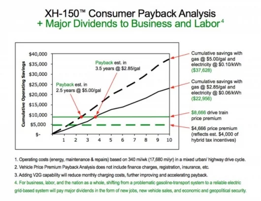 “Extreme Hybrids don’t need high priced technology and don’t require new or expensive fuels, such as hydrogen, which, according to Argonne National Labs, will cost twice as much as gasoline at the pump and require installation of an infrastructure costing half a trillion dollars. The Extreme Hybrid is not a concept,” said AFS Trinity CEO Edward W. Furia, “but a practical alternative that relies on cheap electricity from America’s vast existing energy infrastructure—the electric power grid.” Furia also pointed to a recent U.S. DOE study that concluded sufficient excess electrical generating and transmission capacity exists today during off-peak hours in America’s power grid to recharge 84% of America’s light duty car, truck and SUV fleet—184 million vehicles— even if they were all converted to plug-in hybrid drive trains. The Extreme Hybrid tests just completed at Michelin’s Laurens Proving Grounds in South Carolina produced . . . . . . more than 150 miles per gallon of gasoline based on the EPA Combined Urban/Highway Driving Cycle with 6 days per week of 40 miles per day in all electric mode and one day at 100 miles with assistance of the gas engine. Different driving patterns will produce different results. . . . 40 mile all-electric range on a single, overnight charge. . . . Extended range of 400 miles with hybrid operation. . . . rapid acceleration in all modes of operation, including all electric mode in which no gasoline is burned at all. . . . highway speeds up to 87 miles per hour in either all electric or hybrid mode . . . Even faster acceleration and higher speeds possible in future production models should the company decide to configure them for such performance. “Keep in mind that these results were not in a small two-seater, but in a medium-size family SUV designed to support a serious supermarket run or a family’s weekend recreational activities,” Furia said. According to Furia, the next step for AFS Trinity is to license its breakthrough technology to carmakers who want to incorporate the XH drive train into their vehicles. “That would be our preference,” said Furia. “However,” he continued, “If carmakers decide not to take advantage of this offer, AFS Trinity intends to raise the funds to begin modifying existing hybrids or manufacture its own 150 mpg SUV’s and, eventually, 250 mpg sedans. We believe such production models could be available for sale in three years.” Furia explained, “The SUVs that we just completed that were outfitted with the XH drive train could have been any SUV made by anyone. The XH is a new generation of plug-in hybrid drive train ready to multiply the gas mileage of any SUV or any standard sedan.” “In spite of growing popularity of hybrid vehicles,” Furia said, “none of them have delivered gasoline savings sufficient to repay the purchase price premium of the hybrid system during the useful life of the vehicle. With the Extreme Hybrid that is about to change.” Extreme Hybrid technology in commercial production is expected to cost around $8,700 more than current, gas-only SUV’s. “However, if the price of gasoline is, say, $2.85 per gallon, XH gasoline cost savings could repay the purchase price premium in 3.5 years,” Furia said. “The higher fuel prices go, of course, the faster the premium is repaid. At a price of $5 a gallon, which is the price already being paid in parts of the world, the premium could be repaid in less than three years and the savings would continue to grow. Tax and other incentives could accelerate this process.” The technology that made these results possible came from the former space and atomic energy scientists at AFS Trinity's Livermore, California, laboratory with integration of the technology into the American SUVs made possible by respected global automotive engineering leader, Ricardo. “This has been a collaboration of rocket scientists and car guys,” Furia said. “They have taken the best from aerospace and computer science as well as automotive engineering to produce in a very short time frame and largely with off-the-shelf components a working vehicle prototype in which the XH plug-in hybrid drive train has been demonstrated in a family-size SUV.” Furia said, "The Extreme Hybrid drive train is an economical solution to the high cost of gasoline, the dangers of oil dependence and the environmental damage caused by too much gasoline being used to travel too few miles.” “This is a time in automotive development where many promises have been made and a wait-and-see attitude has developed,” Furia said. “The XH-150 is not a promise but a fact with ‘tires to kick.’ The XH-150 does not require exotic or controversial fuels, it works within the present energy infrastructure, and components are available off-the-shelf at reasonable prices – prices that will only drop lower as volume demand increases. Just as important, XH production vehicles are capable of being built now at prices many people can afford.”