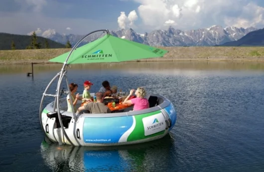 May 16, 2008 We’re always up for writing about new ways for people to get together and have a good time and we’ve hence covered some great moveable entertaining concepts such as the Pedalpub, the Fuya-Jo party van, Red Bull’s nightclub on wheels and the floating beach party. Now there’s another ingenious conveyance to add to the category – part restaurant table, part BBQ, part lounge and part water activity platform, this electric-powered, water-going party platform for ten is primarily aimed at the rental market where its versatility makes it suitable for myriad applications. Indeed, it’s an entrepreneurs’ dream.