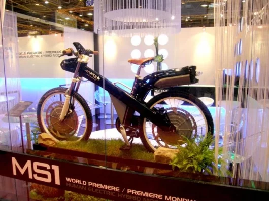 October 31, 2007 Matra Manufacturing & Services (Matra MS) has turned its attention to the production of Light Electric Vehicles with the release of numerous high-performance electric bicycles and quadricyles beginning in 2006. The latest offering from the company renowned for its past achievements in the automotive design arena – including a stint in Formula One in which it won a world title (with Jackie Stewart driving in 1969) and winning the Le Mans 24 hour race with its own V12 engines - is the MS1, a “Human Electric Hybrid Motorcycle” shown recently in Paris that is expected to hit the market in the spring of 2008. Powered by a 1kW Motor Wheel, the MS1 has its maximum speed limited to 28mph (45 kmh) in electric mode and can travel up to 62 miles (100 km) - depending on type of battery - on purely electric power… and if you run out of juice there is always the ever-reliable (9-speed) pedal-option.