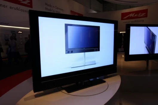 The Metz Primus 55 FHDTV 200 twin R was shown for the first time at IFA in Berlin yesterday and it’ll be as close to the state-of-the-art all-purpose TV when it goes on sale in November. As brilliant (200 Hz, 1920 x 1080, LED and backlight with Local Area Dimming) as the 55 inch picture is, it’s the connectivity (integrated HDTV tuner, DVB-C and DVB-T), separate sound module and 500 GB digital recorder (PVR) which makes it very special – open the back and there’s a circuit board designed for easy removal and upgrading. They’re the first to do it and won’t be the last!