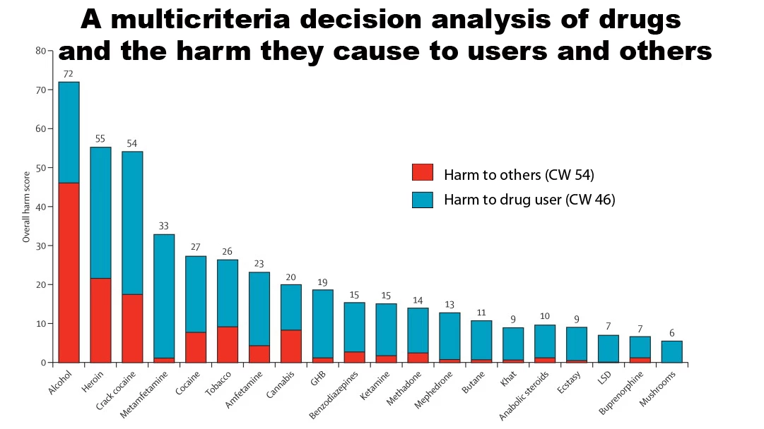According to the report, which is available free (once you have registered at the Lancet), the most harmful drugs to users are crack cocaine (37), heroin (34) and metamfetamine (32), whereas the most harmful drugs to others are alcohol (46), heroin (21) and crack cocaine (17). When the two-part scores were combined, alcohol was the most harmful drug by a huge margin, followed by heroin and crack cocaine.