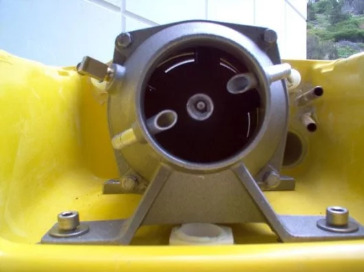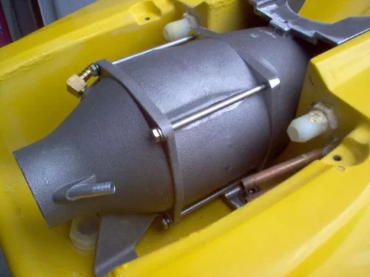 Another design challenge was to route the high performance "expansion chamber" two-stroke exhaust system within the body of the JetBoard and to couple it with a one-way valve water box silencer system that prevents water from flowing into the engine.