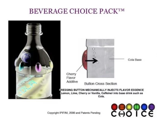 September 22, 2006 Packaging that intelligently enhances its contents with increased consumer customisation and personalisation choices is on the way and Ipifini’s choice-enabled packaging could well change the way liquid products are manufactured and marketed across multiple segments. The Programmable Liquid Container employs buttons on the container's surface that release additives (flavours, colourants, fragrances) into the liquid. The additive buttons allow the consumer to choose variations of the liquid in the container at the point of consumption. For example, a programmable cola bottle with buttons for lemon, lime, vanilla, and cherry flavors as well as a caffeine button allows for 32 potential choices of soda.