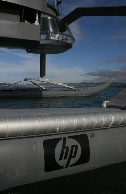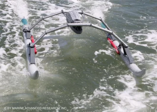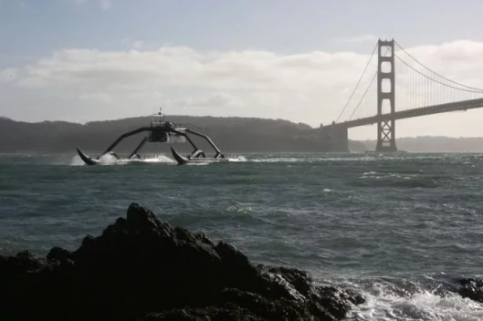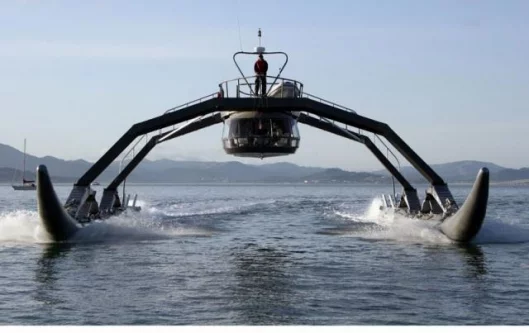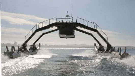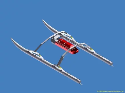 January 30, 2007 Last November we wrote about a extreme experimental boat that had been seen in U.S. waters and at that time, little was known about the amazing spider-like water craft. Now we can lift the lid on the machine, based on an original concept by Ugo Conti of Marine Advanced Research. The appropriately named Proteus (Proteus was an early sea-god capable of changing shape and assuming many forms) is the first of a new class of watercraft based on a patented technology that delivers a radically different seagoing experience. Wave Adaptive Modular Vessels (WAM-V) are ultralight flexible catamarans modularly designed to allow for a variety of applications and to fit the requirements of specific users, missions or projects. Unlike conventional boats that force the water to conform to the their hulls, the WAM-V adjusts to the surface of the sea, with the superstructure flexibly connected to specially designed pontoons by several components that actually move in relation to one another. Springs, shock absorbers and ball joint articulate the vessel and mitigate stresses to structure, payload and crew. Two engine pods, containing the propulsion and ancillary systems, are fastened to the hulls with special hinges that keep the propellers in the water at all times. The modularity of a WAM-V allows the payload to be switched with a different one in less than an hour. In most versions, the payload is a self-contained craft that can lower to the surface, detach and operate under its own power. The switchable payload module effectively changes the WAM-V into an entirely different craft in less than an hour. Some examples of possible payload modules include a luxury cabin for two, cruising accommodations for six passengers, twelve passenger transport, a scuba diving platform or an emergency response unit.