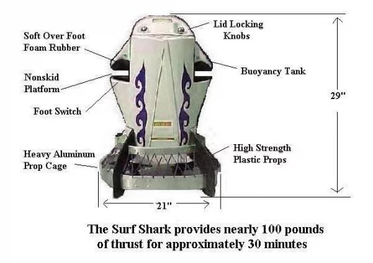 In terms of usage, the Surf Shark was specifically designed to be used in heavy surf and has the power to catch any wave and drive off it. In terms of diving, the units are not recommended for deep water dives. Tippmann Aquatics, recommends a maxium depth of 25-30 feet although reports having exceeded 50 feet without problems. The Surf Shark weighs 52 pounds without batteries and the two 20 pound batteries bring the total weight to 92 pounds, though the in-water feel of the Shark is neutral and fits between the ankles with padding all around. The Dolphin weighs 33 pounds without batteries. Under your right foot on the platform they have a pedal switch. Push it down and the thrust starts and when you let up on the pedal or step off, it comes to a quick stop.