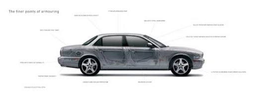 November 24, 2005 Our “Bloody Brilliant” Award for this week goes to Jaguar which has just announced a new Armoured XJ Long Wheelbase luxury saloon car. This is the first widely-available armoured passenger vehicle. The world can be a hostile and dangerous place with hundreds of war zones around the world at any given time, plus many countries where assassination and kidnapping are routine. Despite wars and organized criminal activity, life has to go on, and there are some people who feel the need to be transported in the manner befitting their station in life. An armouring industry has grown up around the 50 wars that are going on in the world, with various degrees of robustness ranging from the Donald Rumsfeld’s preferred choice of the Rhino Runner, to the Combat T-98 Armoured Luxury SUV.