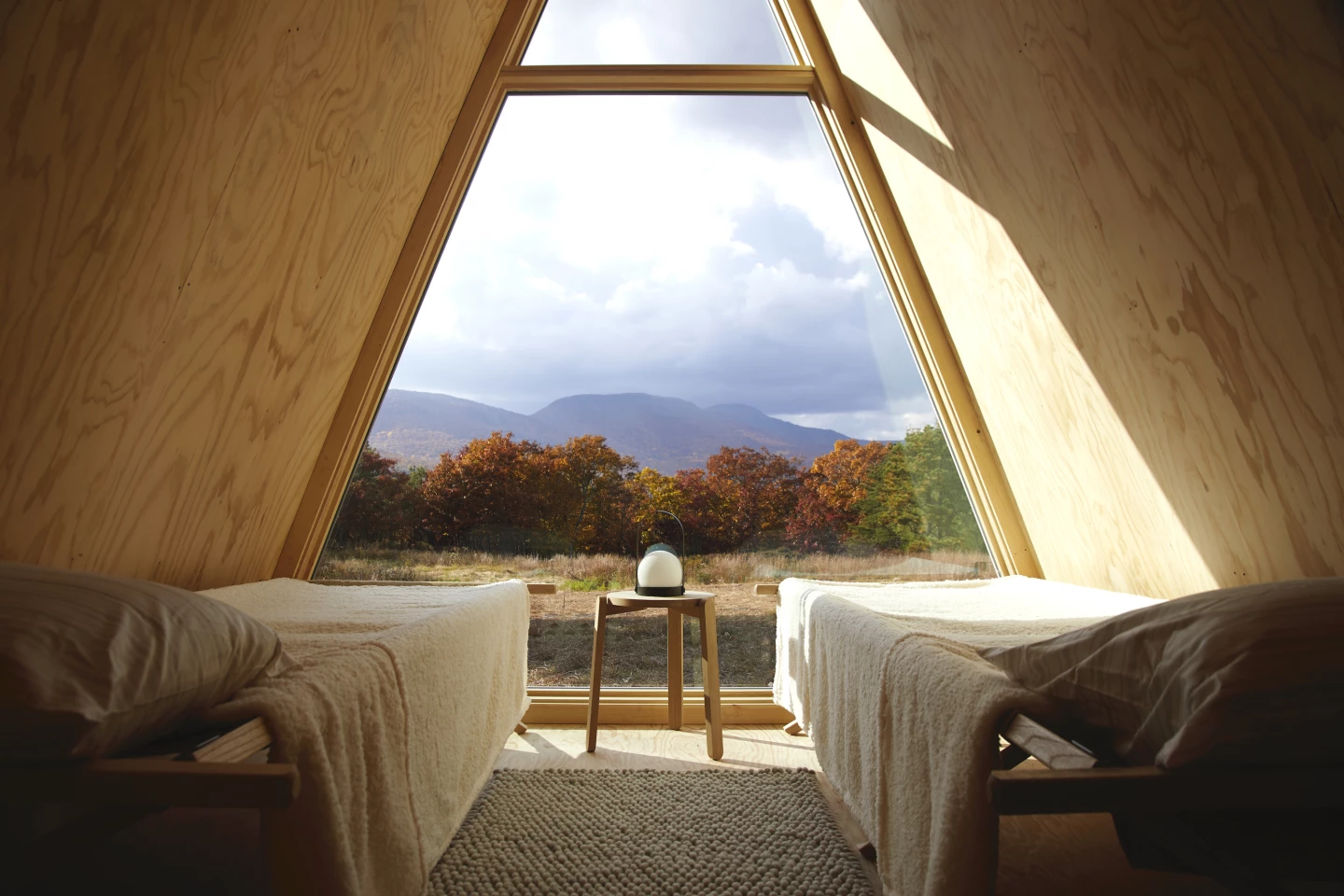 The cabin measures a snug 115 sq ft (10 sq m) and consists of a timber frame, with the exterior finished in either black or silver metal, or natural wood. There are no surprises inside, with a single small space that can be fitted with two beds or one double bed and some seating, for example, a wooden finish, and a large window framing the view (the door is situated on the opposite side to the glazing). It also has an operable window and air vent.