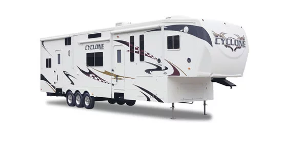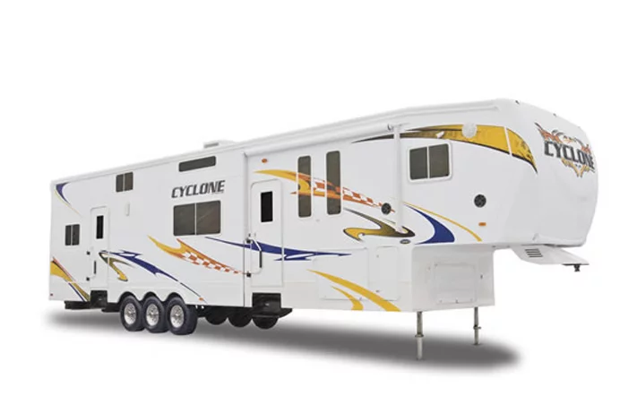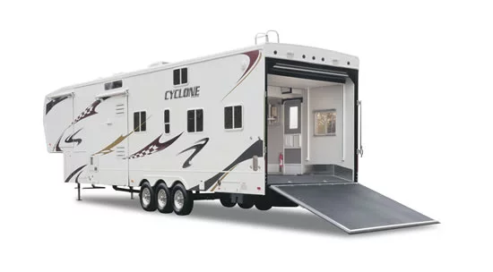 - Cyclone Toy Hauler Fifth Wheel by Heartland – features King-sized bed, hardwood doors, 12-foot cargo/garage area, patent-pending turning radius, diamond-plated toolbox