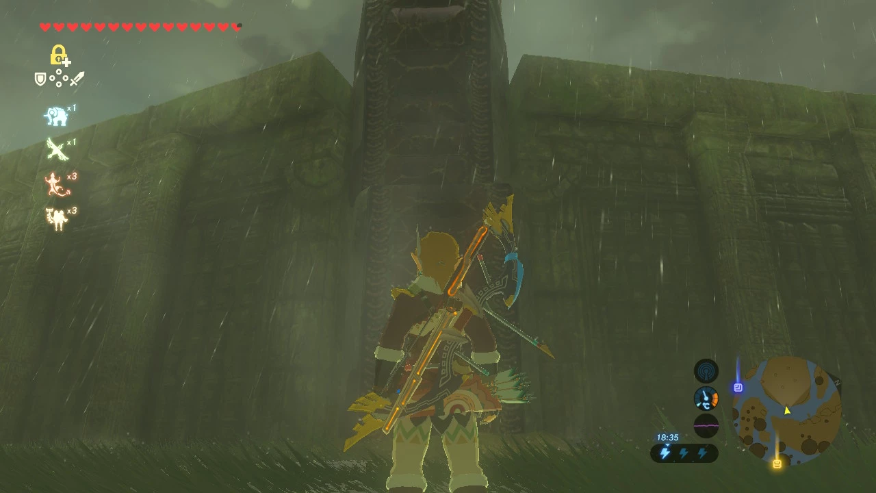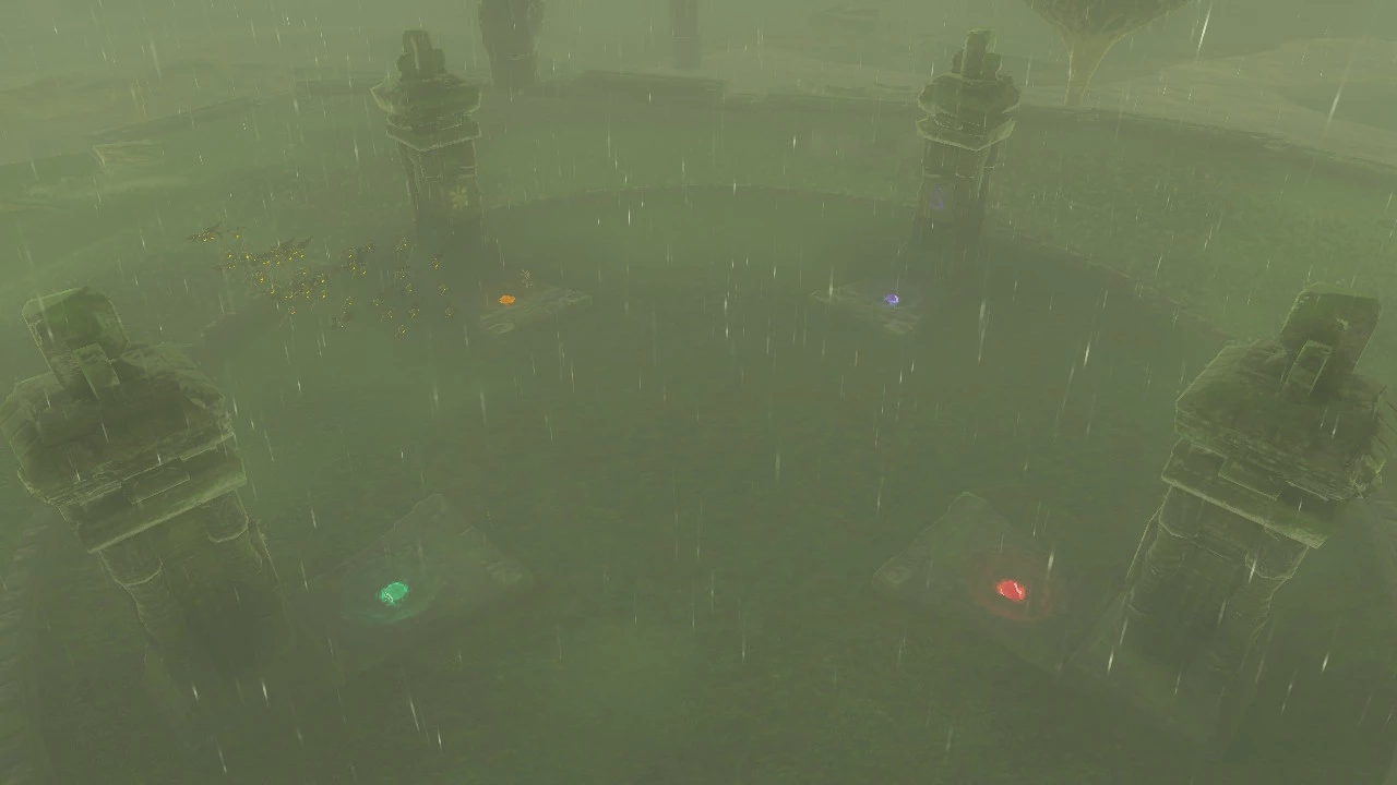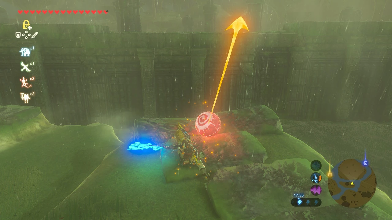 It's raining, but you can use this ledge to climb up onto the raised platform in the center of the area. You'll see a purple orb on the ground, and a blue orb up on one of the pillars.