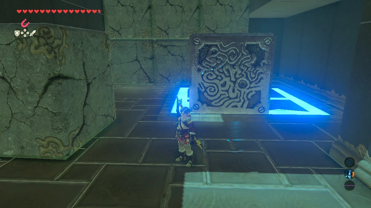 Starting on one side, blow up one row of the blocks to reveal a metal block you can use Magnesis on. Blow up the block between the metal block and the starting platform to find a chest containing the Rubber Armor.