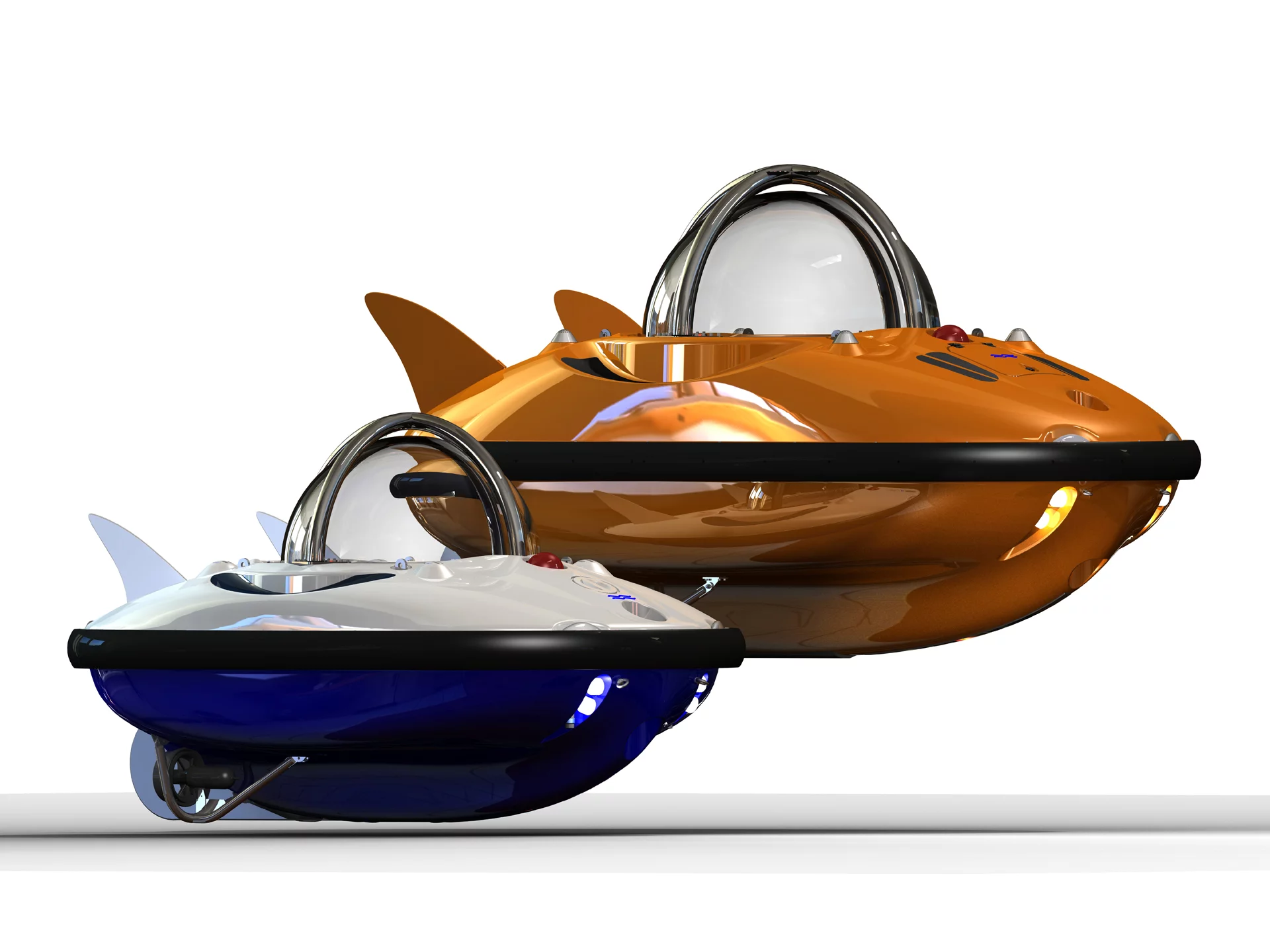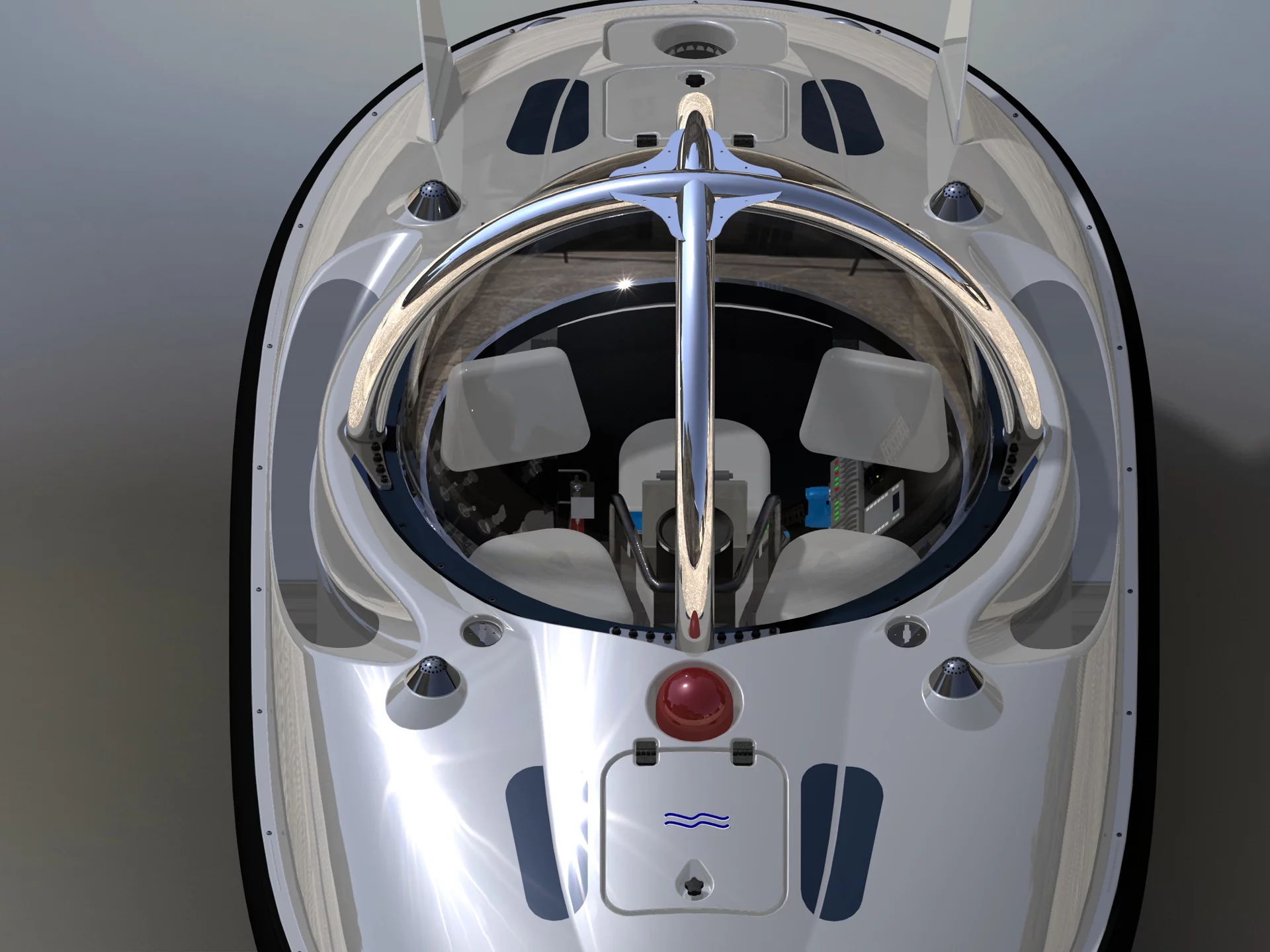 The electrically powered submersible for three people is equipped with Lithium-Ion batteries for long sailing times. The Carbon Dioxide (CO2) produced by the passengers in the pressure vessel is removed by so-called scrubbers, and the oxygen used is also added automatically.