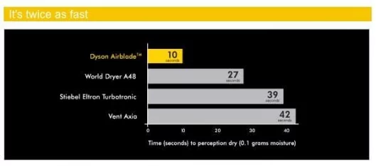 Energy and cost of ownership: Conventional hand dryers consume a lot of energy and take an eternity to dry hands - if you bother to wait. Dyson Airblade dries hands completely in just ten seconds.