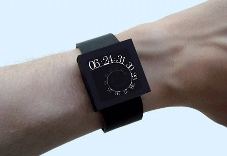 The design has a soft black plastic casing and a customizable face which can be changed from analog to digital. The display can show the minutes and seconds in two small circles, or the numbers can be set to spiral inwards to the center of the watch and disappear.