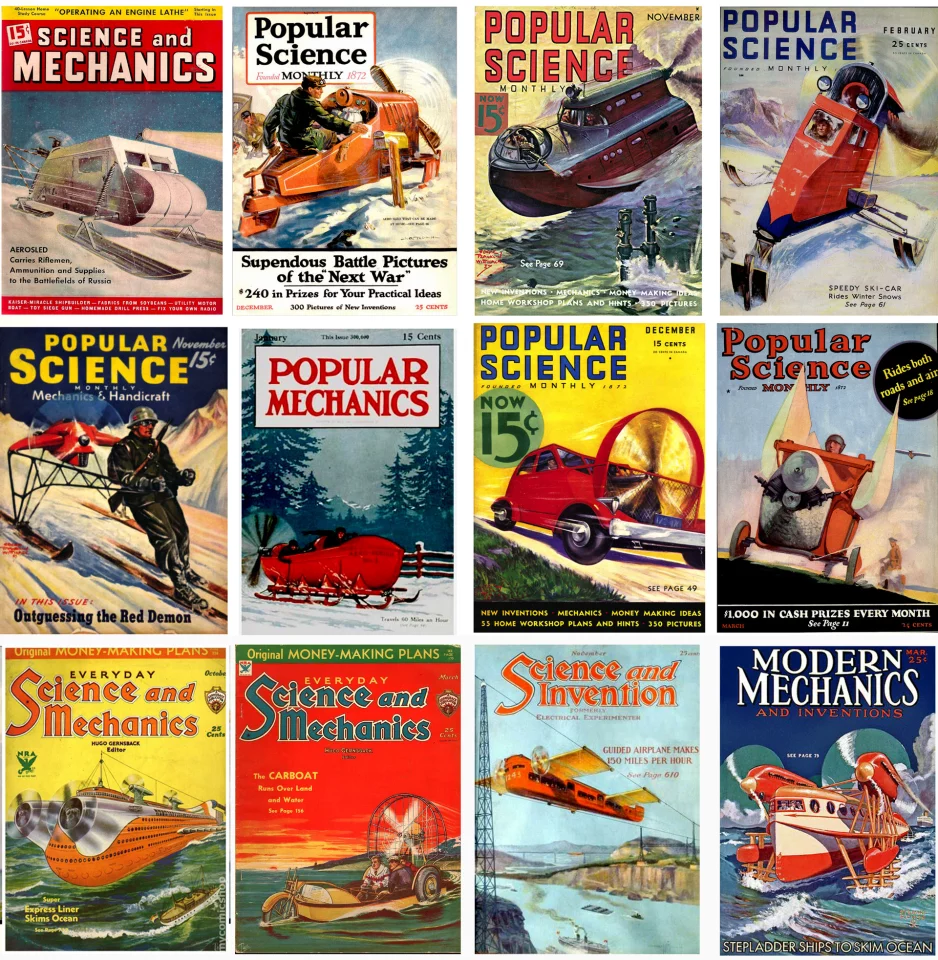 The exciting new military technology would have sold quite a few extra copies of Scientific American at the same time as dispelling any doubts about the legitimacy of pusher engine technology, but the booming newsstand of the day was also bullish about the prospects of adding a powerful aircraft engine to all manner of near-future machinery. The idea of the pusher prop for powering ski-mounted troops (middle left above) has merit, and it might also be a way for less physically capable people to experience cross country skiiing, opening up yet another experiential product for the adventure marketplace.