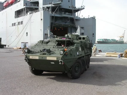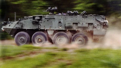 The Stryker is a family of eight-wheel drive combat vehicles built for the US Army that provide a force that will move rapidly as a cohesive combined arms combat team. This is possible because the Stryker combines a number of unique capabilities: it is small and light enough to be transportable in a C-130 aircraft, it is tough enough for the battlefield with integral all-around 14.5mm armour protection, and it is VERY fast for an armoured vehicle being capable of 100kmh on sealed roads and 90kmh off road. With a fuel range of over 450 kilometres, the Stryker can move swiftly across the battlefield or to perform a variety of tasks in any one of its multitudinous guises.
