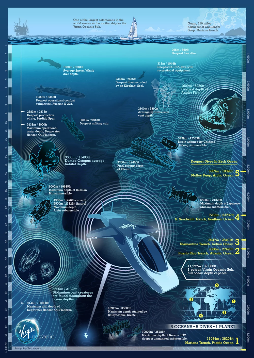 Seventy percent of Mother Earth's surface is covered in water, yet we know more about the moon than we do about our deepest oceans. In yet another ground-breaking initiative under Virgin's multi-faceted "Branded Venture Capitalism", Richard Branson intends to change all that with the Virgin Oceanic Five Dives project.