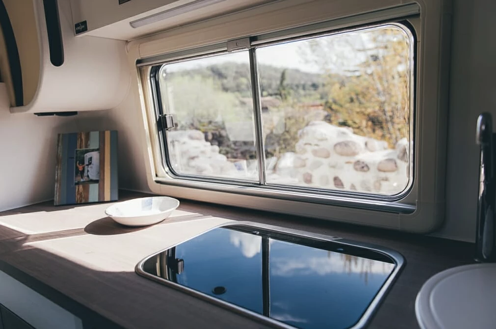 The Kora's design language follows the Amarok's, and the color matched to the truck cab. The baker's dozen of tinted windows looks stylish on the outside and delivers plenty of light and views inside, where GehoCab has created a functional living space with convertible dinette, alcove bed, bathroom and kitchen.