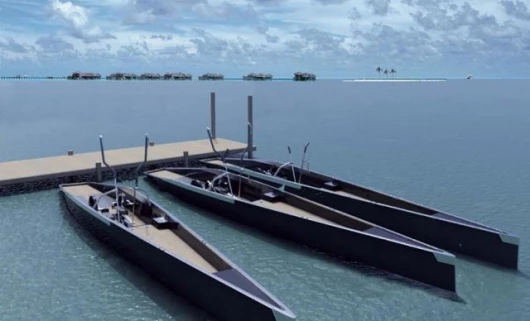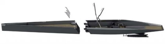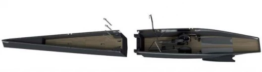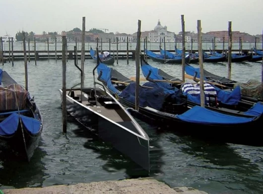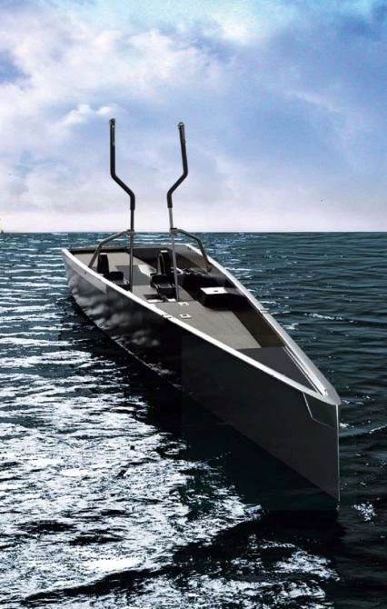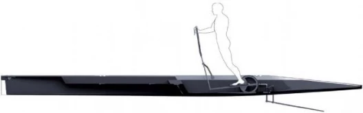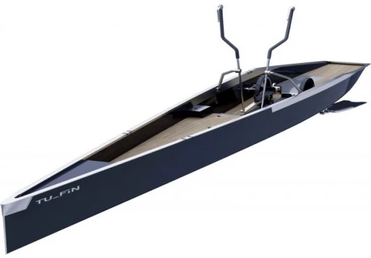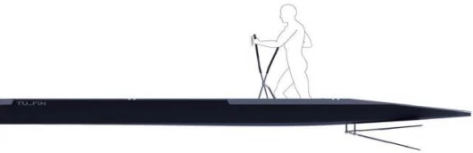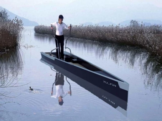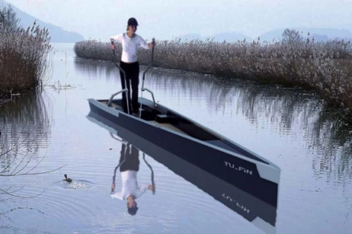 April 4, 2007 Four Architecture students from the Univerity of Munich have come up with a device that combines a gondola with an elliptical trainer to produce a unique sensation of "walking on water." The bizarre "TU-Fin" concept is the brainchild of designers I.Kiryakov, S.Ballmeier, K.Eichelberg & M.Dressler, and is essentially a racing canoe hull with an elliptical exercise machine mounted to it. Exercising on the machine powers a pair of rear-mounted flippers that propel the craft forward to an estimated 6.5 knots. Unlike a rowing action, the user is able to look forwards as they go.