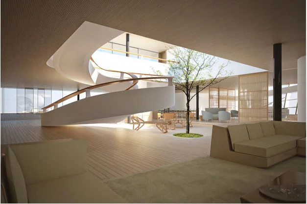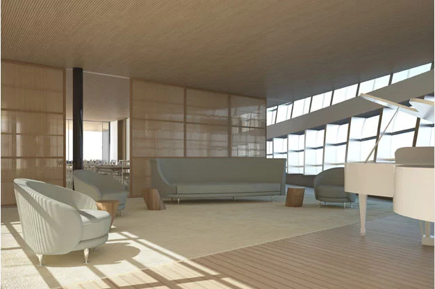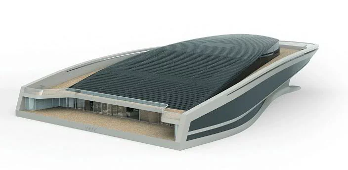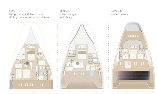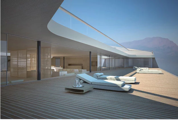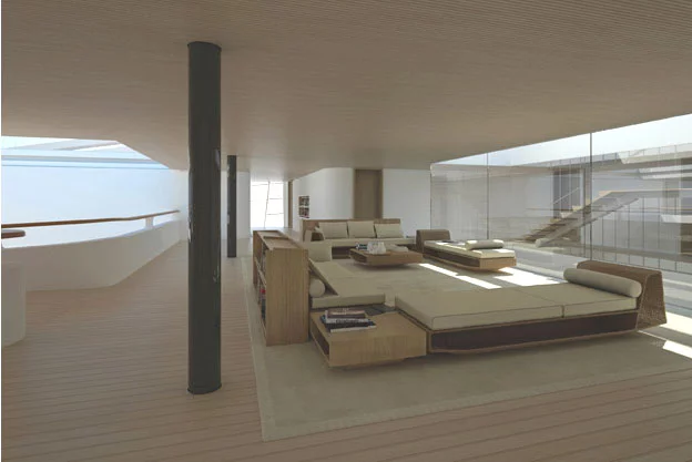 Following this unique adaptation, the decks and the interiors were developed in accordance with the fundamental credo of WHY, 'form-equals-function'. Thus were born other innovations in the world of mega yachts: patios generously flooding the interior with natural light, photovoltaic panels on the glass hull sides, as well as on the roof opening, like Venetian blinds, a 25 metre-long forward end swimming pool, and a 36-metre aft deck beach.