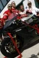 Two-times World Superbike champion Troy Bayliss was given the honour of demonstrating the 1098 F08 machine, which is still in its factory development stage, sporting black carbon-fibre bodywork and aluminium fuel-tank.