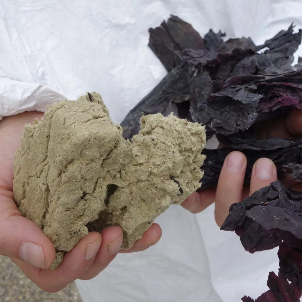 To begin, GXN teamed up with partners from the Danish farming sector to gather biomaterials that would otherwise be burned for energy, things like grass, straw, tomato stems and seaweed. These were then combined into composites to maximize their strength and pressed into boards for cladding.