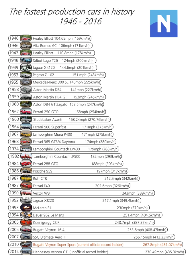 In 70 years, the top speed of the fastest production car in the world has progressed from 104.65 mph (169 km/h) to 277.87 mph (446.97 km/h), an increase of 164 percent.