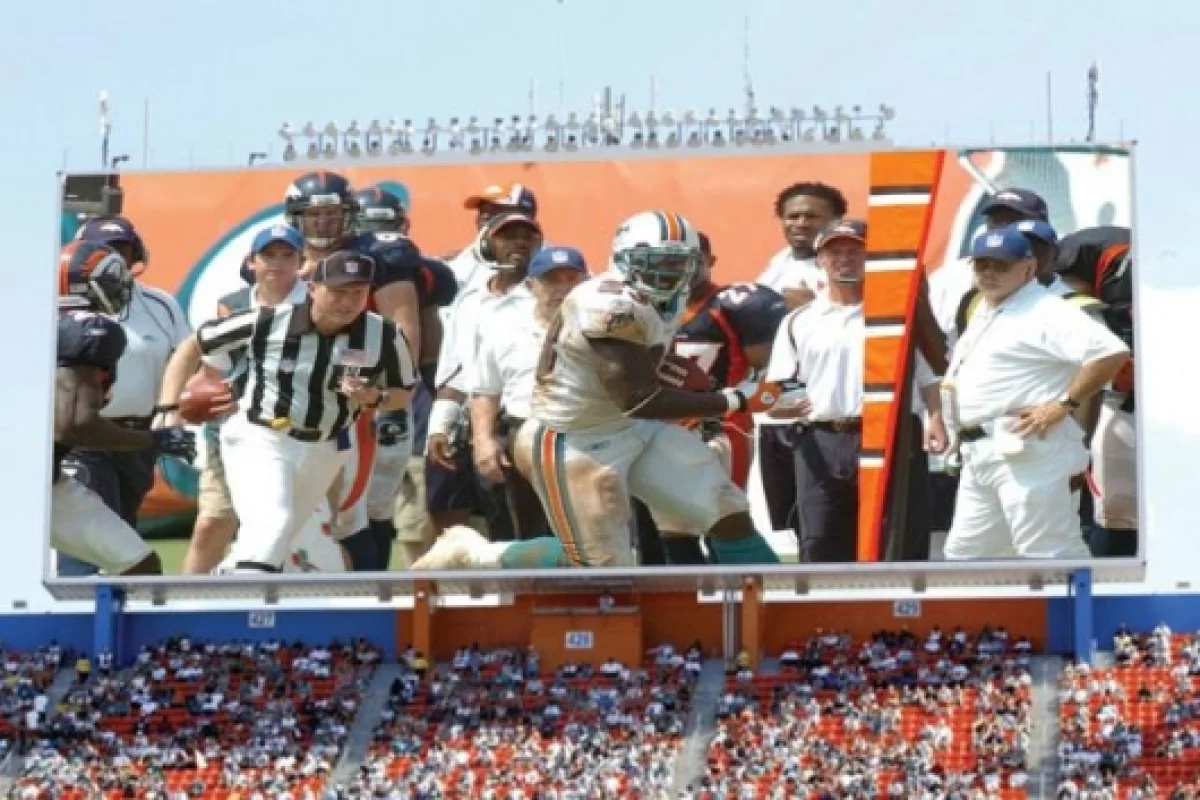 October 8, 2005 Here’s yet another version of one of the world’s favourite games – “mine’s bigger than yours.” Daktronics announced yesterday it has been awarded a contract to design and build the world's largest high definition (HD) light emitting diode (LED) display for Dolphins Stadium in Miami, USA. The display will measure approximately 15.2 metres high by 41.8 metres (636 sq. m) and will best the current record holder, the Turner Field screen in Atlanta which measures 21.6 by 24.1 metres (521 sq. m). The project is scheduled to be completed in time for the 2006 baseball season and although it will be the largest in the world when it is first switched on, the record will fall again later in the year when Tokyo Racecourse will open its 11 metre by 60 metre screen (660 sq.m). Of course that’s just the high definition record – the biggest video display in the world has stood for five years at 4 Times Square, New York and measures 27.4 metres by 36.5 metres for an even 1000 square metres.