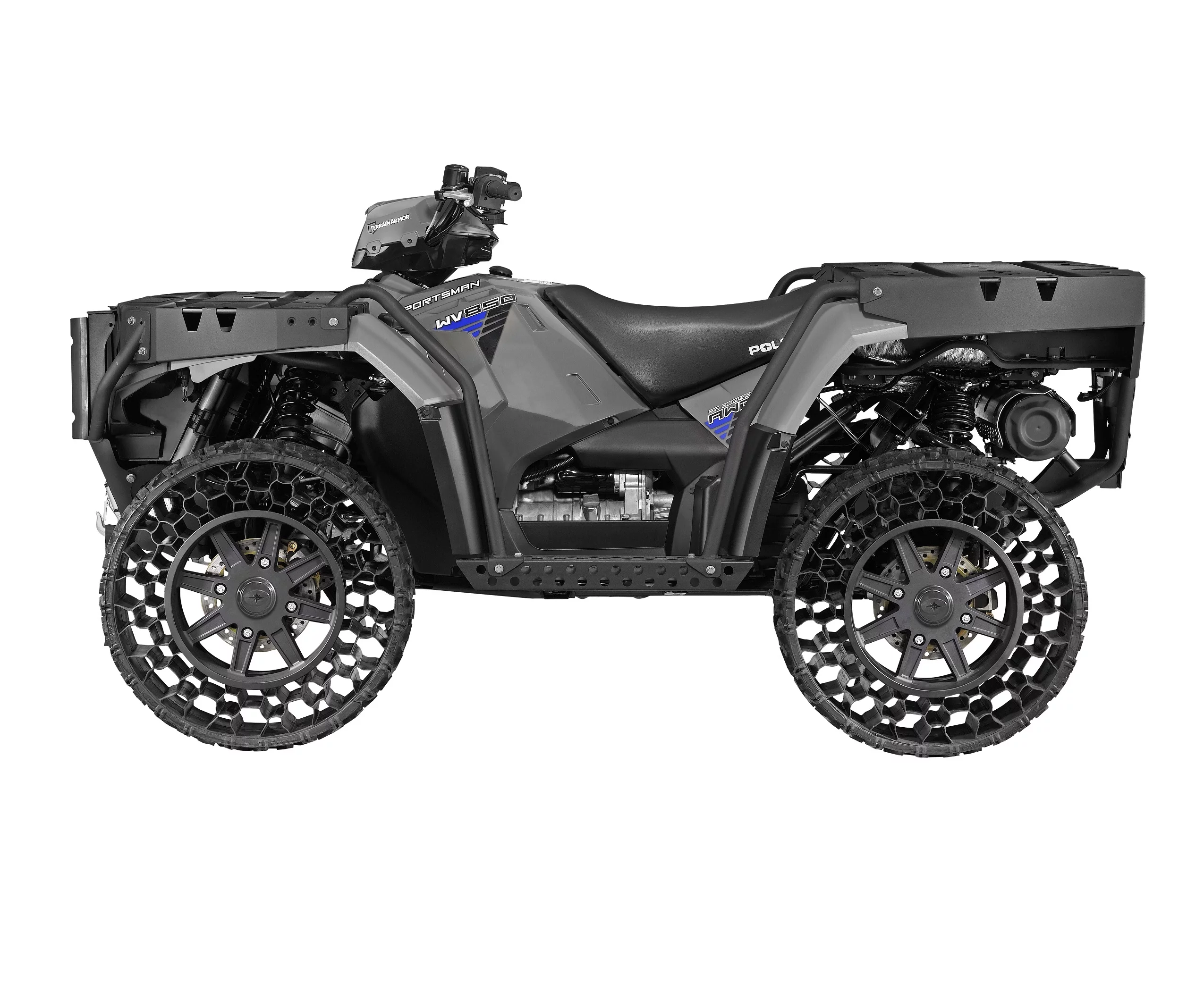 There’s nothing that ruins going to work like having your tires shot out with a .50 caliber machine gun round. If that happens to you a lot, and your commute is across open fields and through the woods, you might want to consider the Polaris Sportsman WV850 HO with Terrain Armor. This military-grade All-Terrain Vehicle (ATV) abandons traditional inflatable tires for Non-Pneumatic Tires (NPT) that feature a flexible polymer honeycomb.