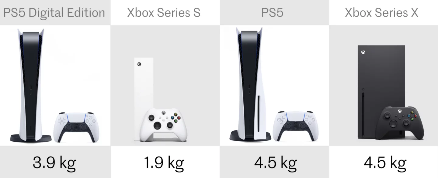 The PS5 and Xbox Series X weigh the same, at 4.5 kg (9.9 lb). The PS5 DE is a little lighter at 3.9 kg (8.6 lb), while the Xbox Series S is a petite 1.9 kg (4.2 lb).
