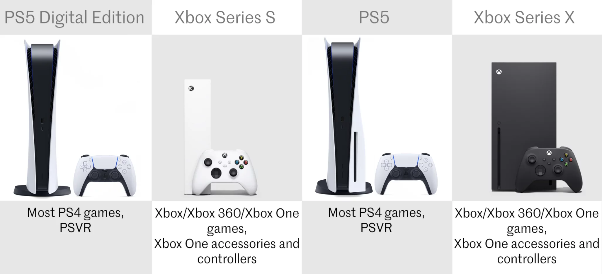 Microsoft has had more of a focus on backwards compatibility, so the Xbox Series S and X will run most Xbox One games (except those that use the Kinect), as well as many more from the original Xbox and Xbox 360. All accessories and controllers from the Xbox One can be used too – again, with the exception of the Kinect.